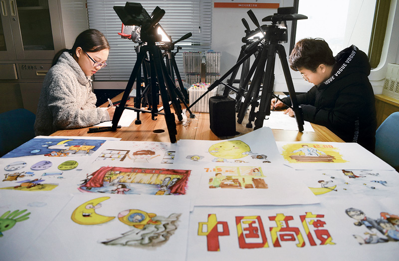 传播主流价值,开展思想政治教育,受到学生欢迎。图为“一分钟”微视频团队的学生在绘制简笔漫画。 新华社记者 马宁/摄