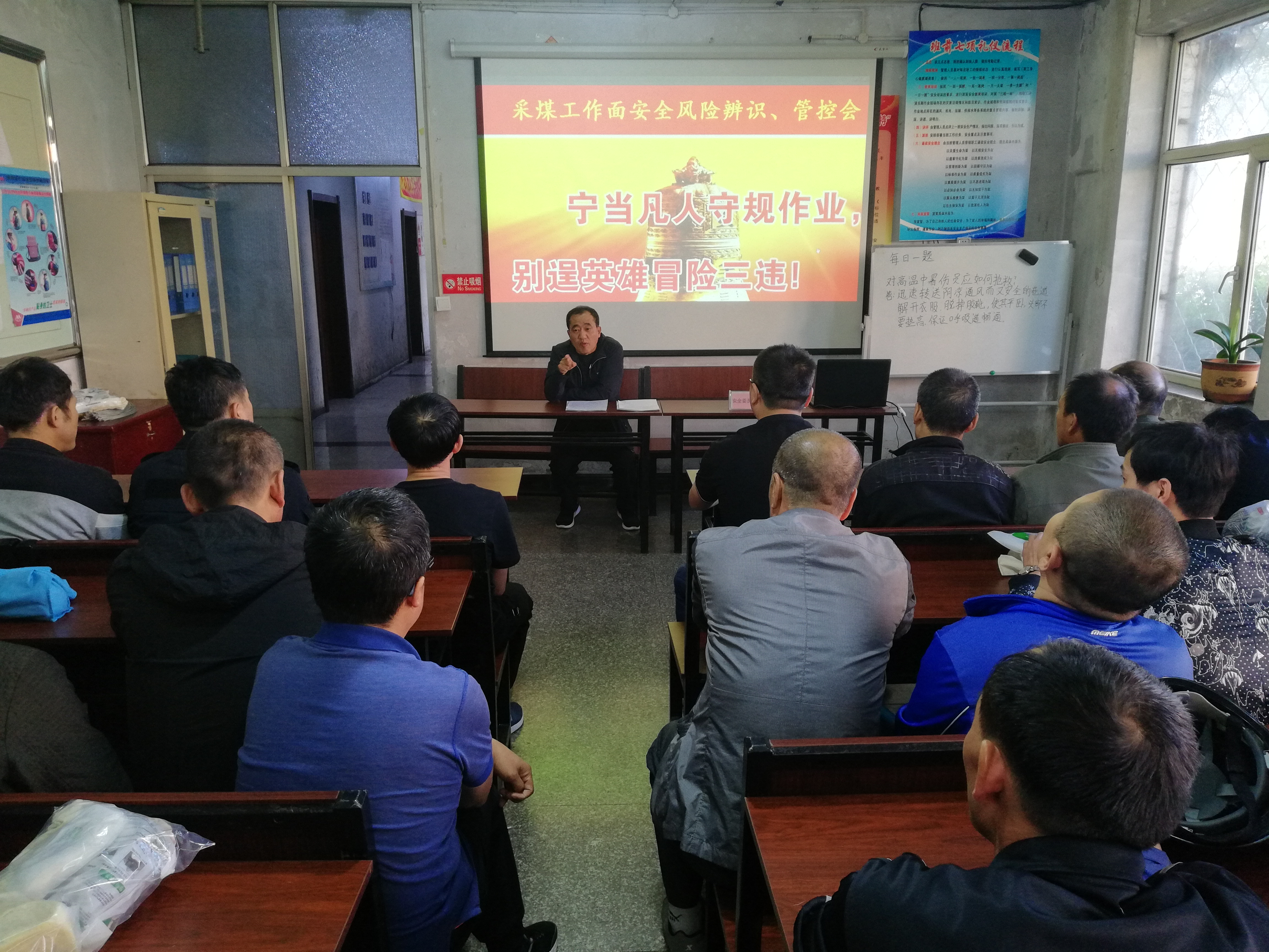 新陆矿扎实深入开展“安全警示教育月”活动, 连日来,这个矿副总以上领导深入到采掘区队职工班前上安全大课,讲解安全知识,提高安全生产防范意识和操作技能,确保实现安全生产。图为安全大课现场。王满昌  摄