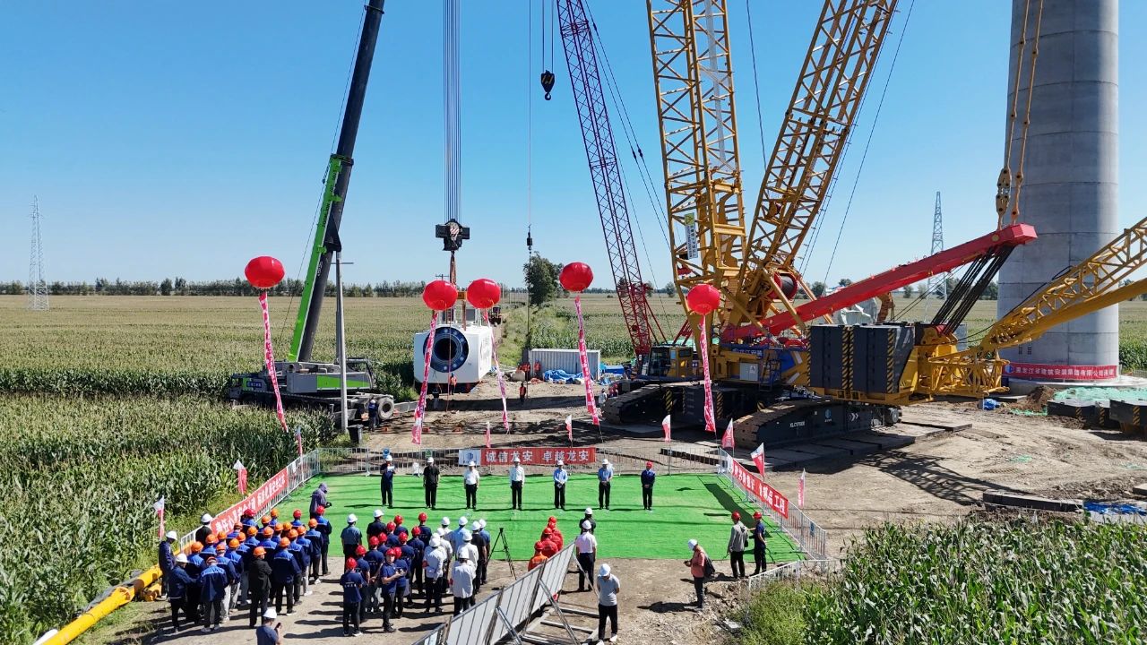 该项目位于双鸭山市集贤县境内,位列全省重点项目之一。项目占地约297平方公里,总装机容量200兆瓦,施工内容包括安装32台单机容量为6.2mw的风力发电机组,配套新建一座220千伏升压站。项目投运后,预计每年可产生清洁能源约7.4亿千瓦时,节约标准煤约23.67万吨。项目于2024年3月1日开始首台机组吊装,为推动施工进度,确保吊装作业顺利实施,项目指挥部联合施工单位、监理单位提前谋划、精心组织,多措并举,严格落实安全、质量、进度各项保证措施,积极协调内外部关系,克服严寒、阻工、地形分散等重重困难,历经186天夜以继日的奋斗,圆满完成了全部32台机组的吊装工作。